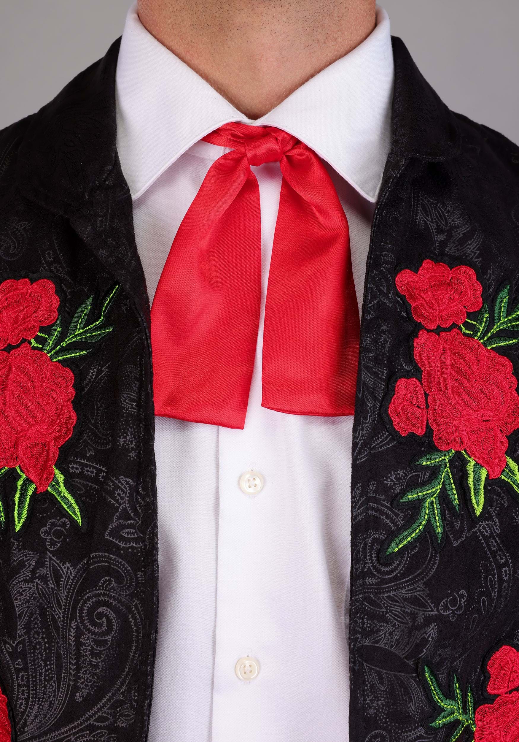 - Jacket has red ball fringe edging, embroidered roses on front panels and sleeve cuffs
