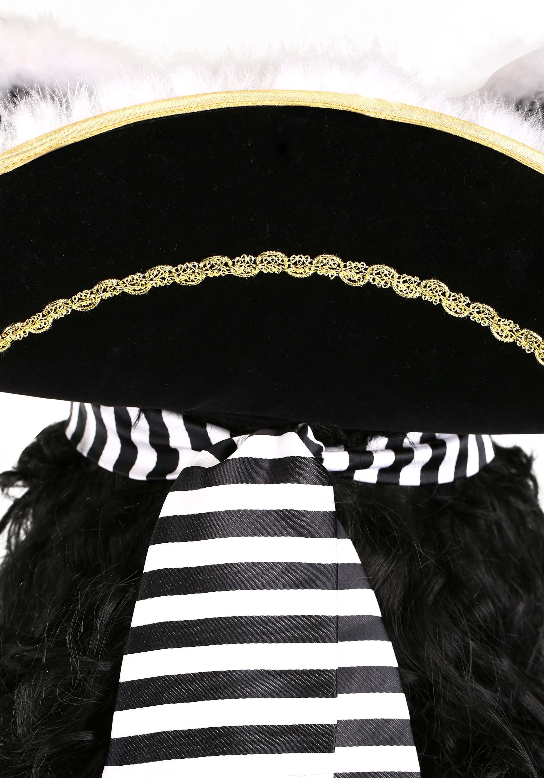 - Hat has feather and gold braid trim, attached striped scarf to tie as desired