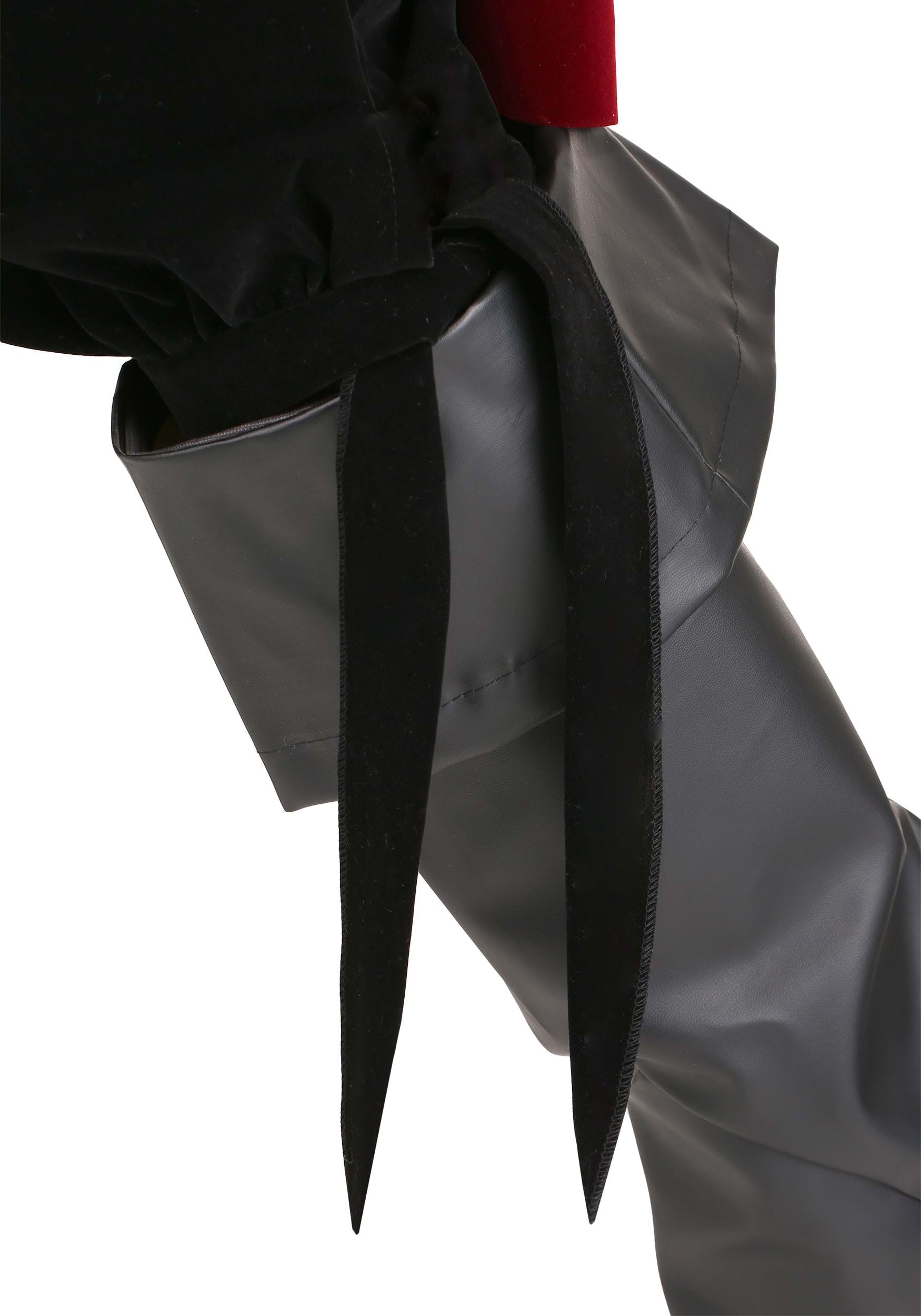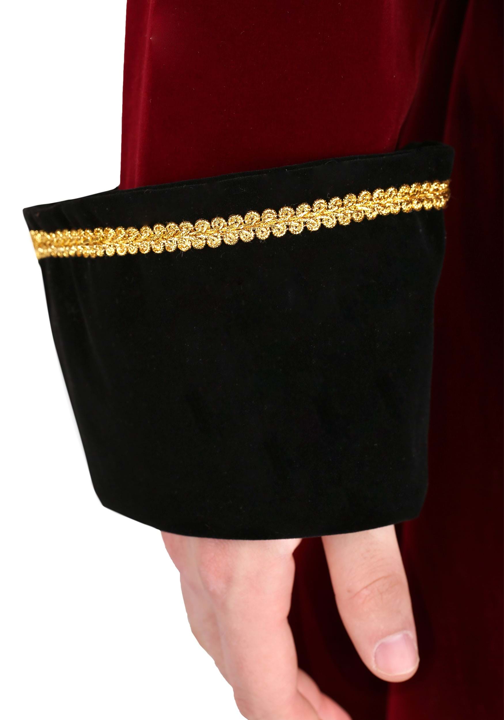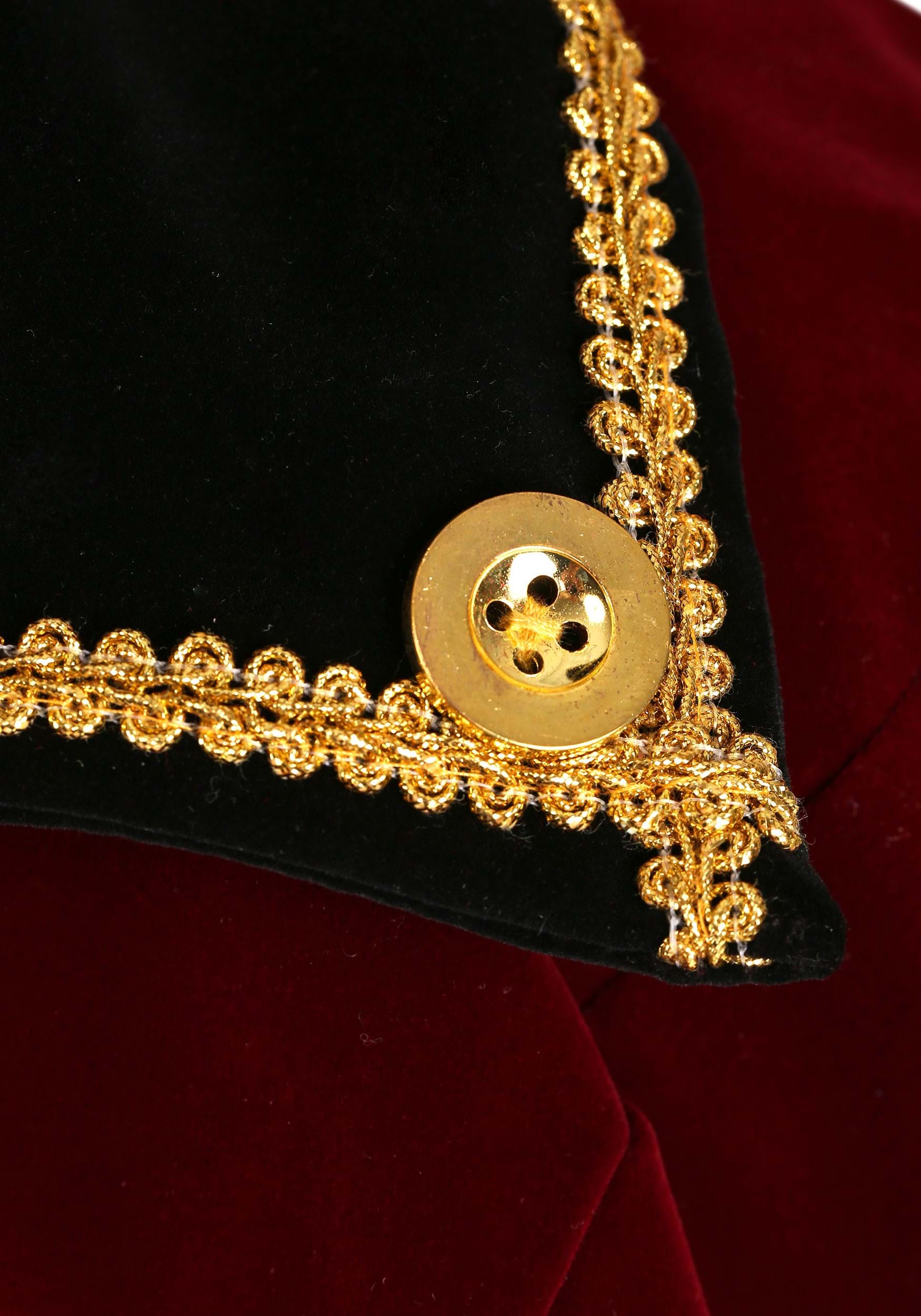 - Maroon velvet jacket has black velvet collar, lapels, sleeve cuffs, & false pocket flaps