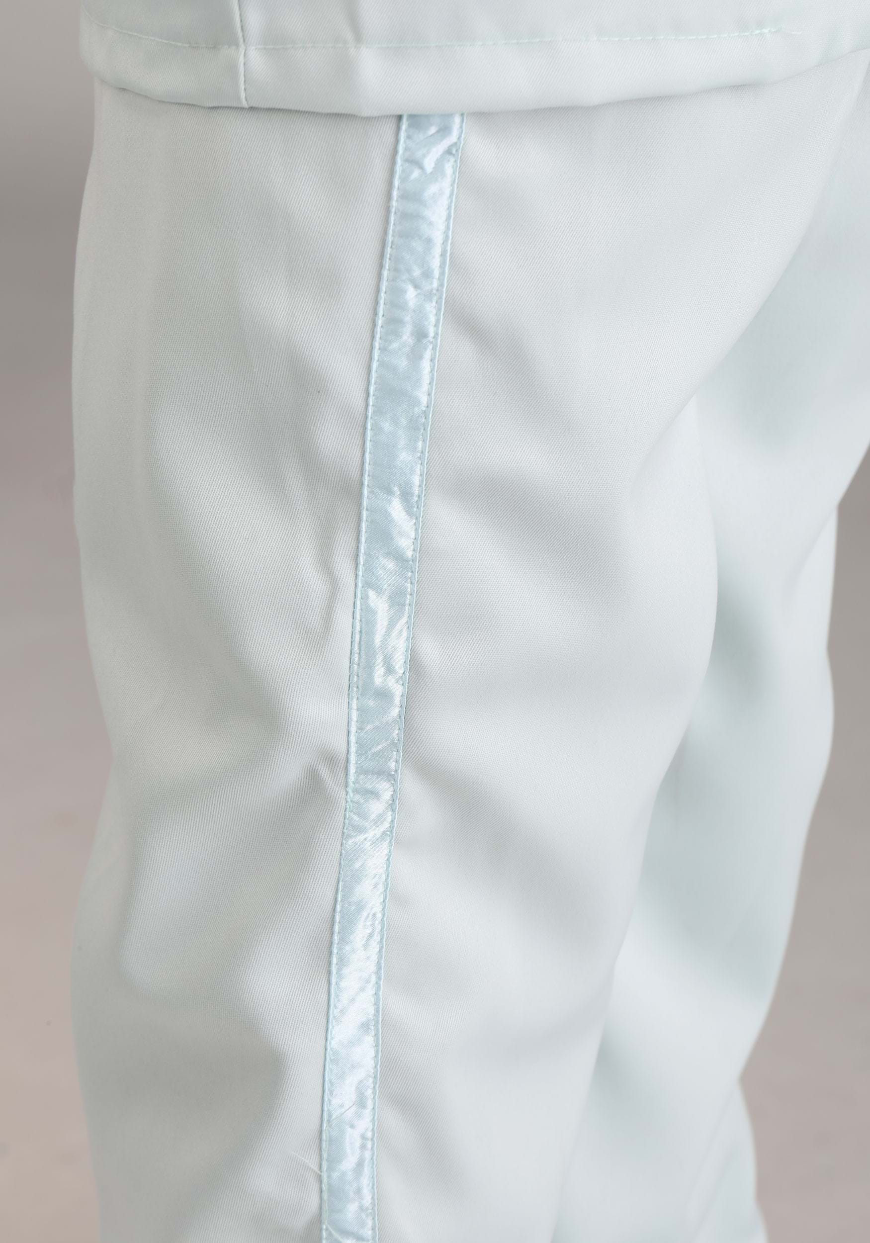 - Broadcloth shirt front has hook and loop tabs at center