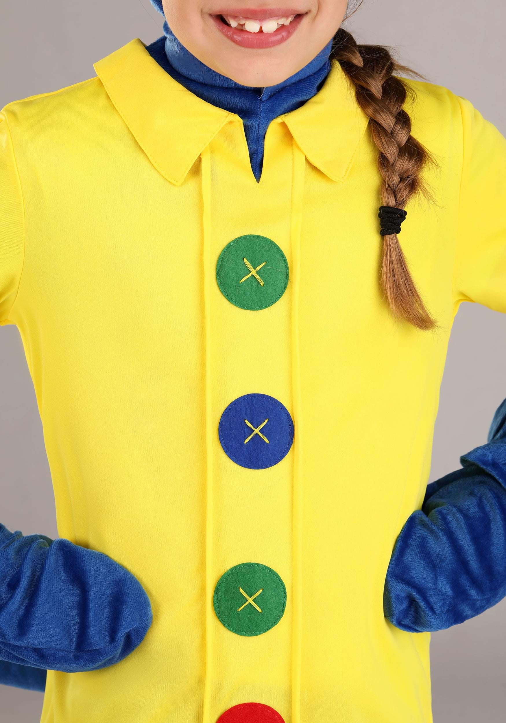 - Shirt has column of appliqued felt buttons at center front
