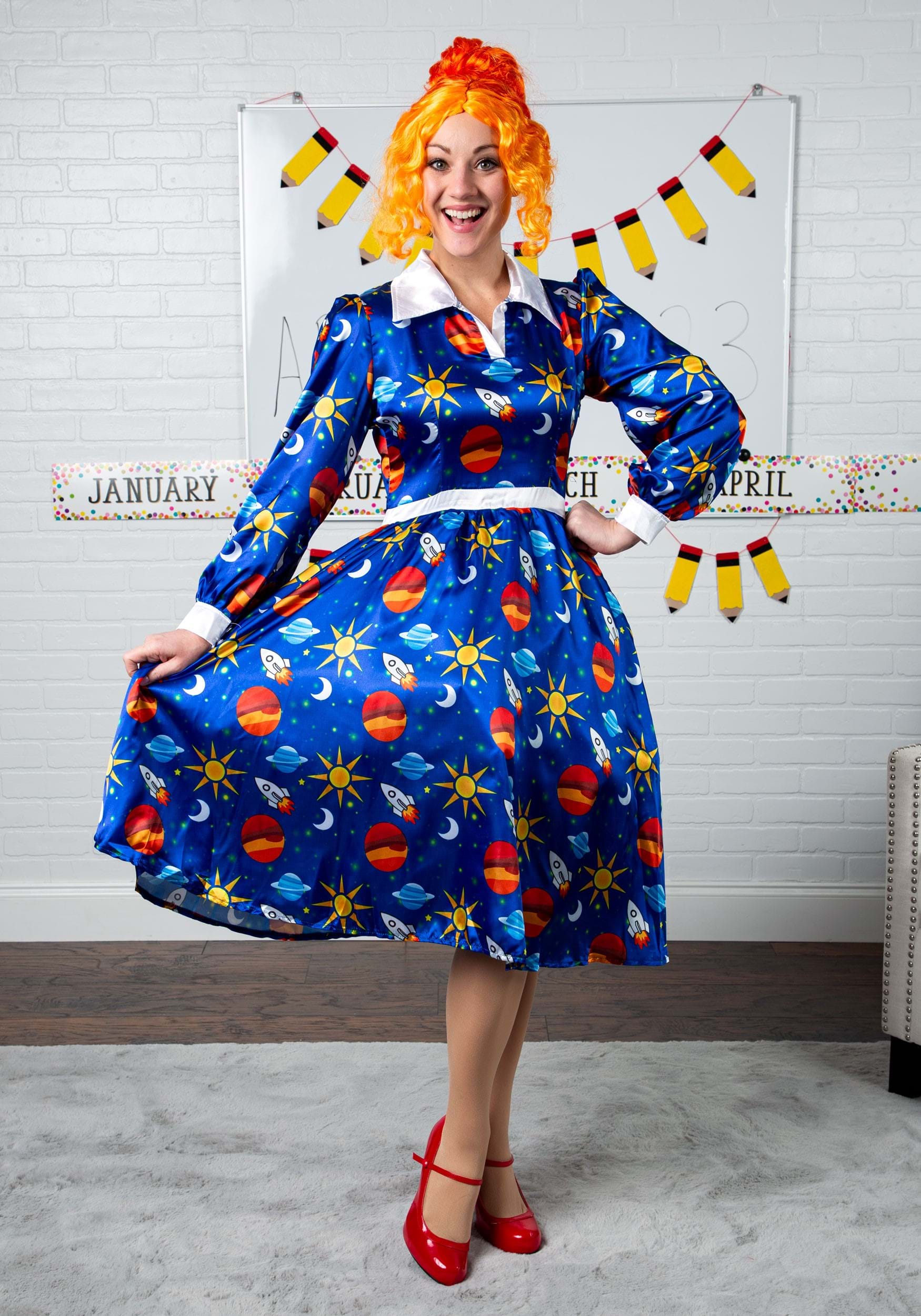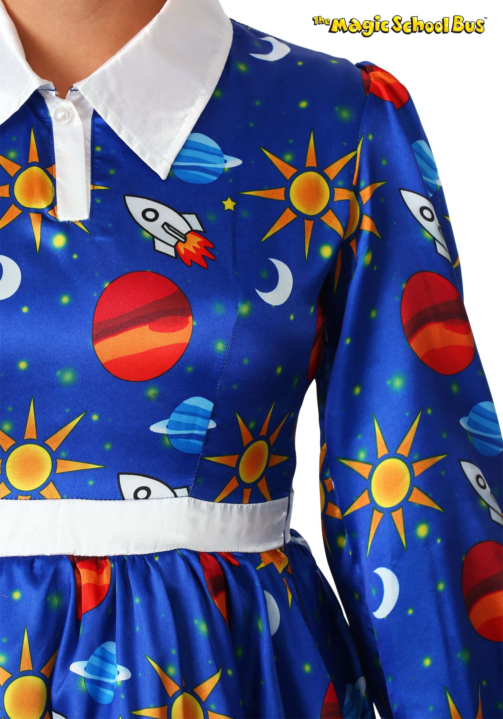 Aquí en Halloweencostumes.com, hacemos las preguntas importantes. ¿Qué está pasando con el vestido de la Sra. Frizzle? ¿Júpiter, Saturno y un cohete están allí? ¿Lo hizo ella misma? ¿Y cómo podemos tener acceso a un Autobús Escolar Mágico como el suyo? Bueno, todavía no hemos descubierto dónde conseguir un autobús escolar como el que ella usa en los libros y el programa de televisión, pero sí resolvimos el misterio de su vestido. Lo encontramos, y sí, definitivamente tiene Júpiter, Saturno y cohetes en él. Ahora, puedes tener el mismo vestido que usa, ¡ya que se lo ofrecemos a todos los fanáticos de The Magic School Bus! P>