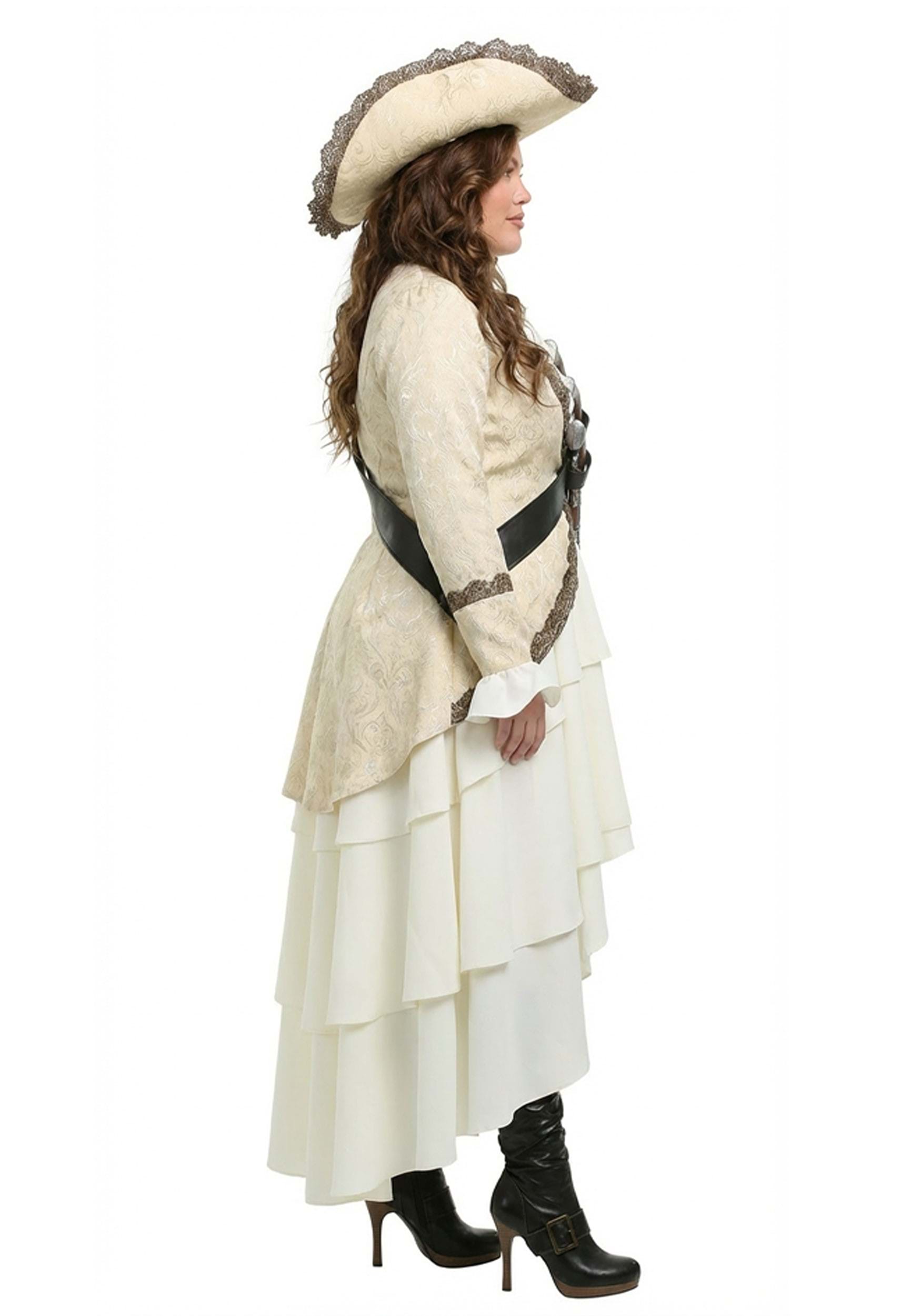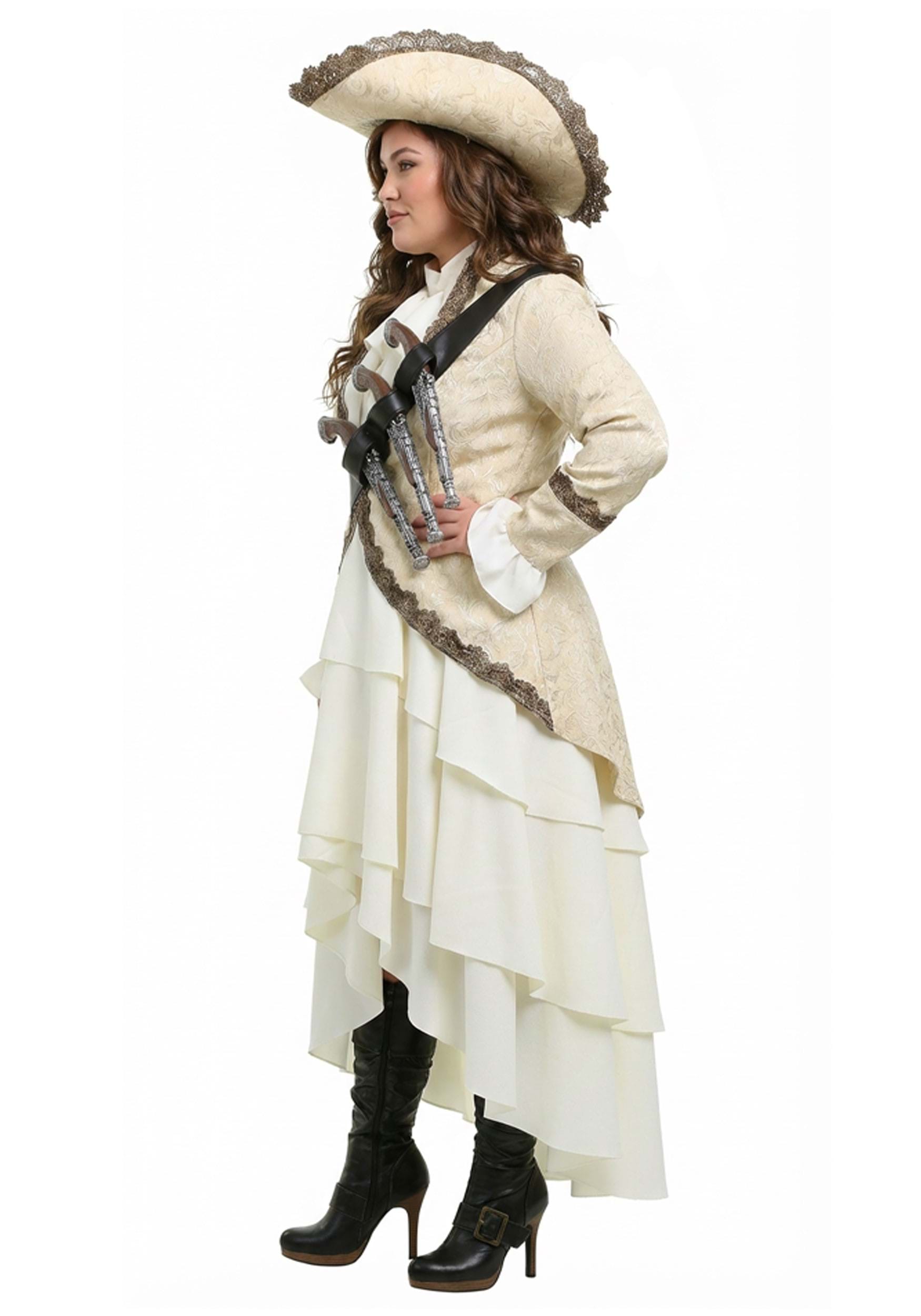 Te verás como el arquetipo de un sofisticado capitán del 1600 en esta chaqueta con borde de encaje color marfil y falda blanca con capas. Conservarás esa sensación de autoridad con el sombrero de ala ancha, mientras que el cinturón cruzado con espacio para tres armas de tu elección permitirá que esas dos igualmente imparciales autoridades sepan que no eres nadie con quien jugar. Solo asegúrate de divertirte con tu nueva apariencia, después de todo, ¿para qué sirve la vida del pirata si no puedes divertirte con ella? P>